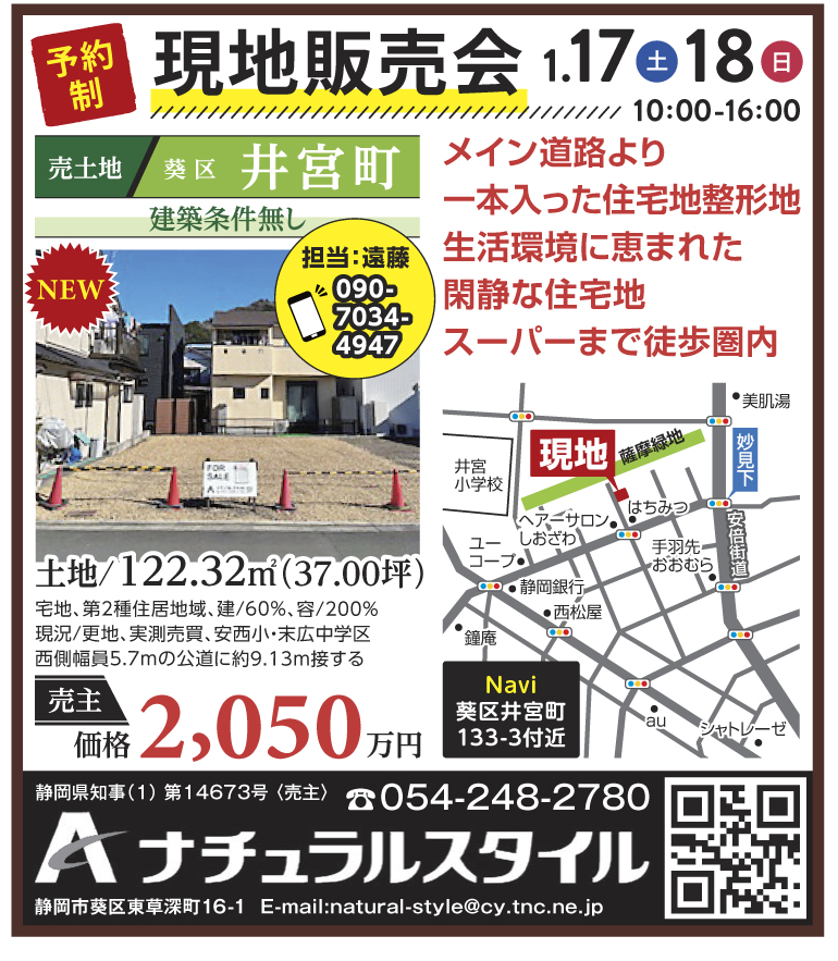 葵区井宮町土地【予約制】 10:00~16:00 メイン道路より一本入った住宅地整形地生活環境に恵まれた閑静な住宅地 この物件の詳細 葵区井宮町土地 ご予約・お問い合わせはこちら お電話の場合はこちら 054-248-2780(担当:遠藤) ご予約フォーム 必須項目をご入力いただき、送信ください。 担当者から後ほどご連絡させていただきます。 プライバシーポリシー 個人情報の取り扱いについて 株式会社ナチュラルスタイル(以下「当社」)は、当社が運営するウェブサイトのご利用者(以下「お客様」)のプライバシーを尊重し、個人情報の保護に関する法令を遵守するとともにお客様の個人情報の保護に努めます。 1.個人情報の利用目的について 当社は、お客様の個人情報を下記に記載する目的において利用いたします。下記に該当しない目的で利用する場合には、あらかじめその利用目的を明確にし、それ以外の目的で利用することはありません。 ・お客様に当社のサービス及び関連情報をご提供するため ・お客様により良いサービスをご利用するための調査分析及びアンケート調査実施のため 2.第三者への提供について 当社は、下記の場合を除き、お客様の個人情報を第三者に開示いたしません。 ・法令等により司法及び行政機関より要請を受けた場合 ・お客様の同意がある場合 3.個人情報の管理について 当社は、お客様の個人情報を保護、管理するにあたり、外部からの不正なアクセス、個人情報の紛失・破壊・改ざん・漏えい等を防ぐための適切な安全対策を行っております。 4.個人情報の変更・訂正・削除について 当社は、個人情報の開示及び変更・訂正・削除等のご依頼があった場合、そのご依頼をされた方がお客様ご本人であることが確認できた場合のみ、適切な方法で対応いたします。 5.クッキー(Cookies)について 当社のウェブサイトでは、お客様に当社に当社のサービスを便利にご利用いただくためにクッキーと呼ばれる機能を使用することがあります。この機能はお客様のプライバシーを侵害するものではなく、またお客様のコンピュータへ悪影響を及ぼすこともありません。 6.個人情報保護の取り組みについて 当社は、法令等の改正や社会情勢の変化に応じ適宜見直しを行い、改善を図ってまいります。 7.お問い合わせ先について お客様の個人情報の管理等についてのお問い合わせはお問い合わせページからお願いいたします。 必須プライバシーポリシーを確認し、同意しました。 【参加をご希望される見学会について】 必須見学会名 必須参加希望日 —以下から選択してください—91011121314151617時~ 必須ご氏名 必須フリガナ 必須ご住所 郵便番号 都道府県 市区町村 地名・番地 建物名・部屋番号 必須お電話番号 ※過度な営業はいたしませんので、ご安心下さい。 必須メールアドレス ※メールでご返信致します。メールアドレスはお間違いのないよう正確にご入力ください。 過去に弊社物件をご覧になったり、見学会に参加いただいたことがある場合は、物件名をご入力下さい。 物件名 ご質問やご要望など 当ホームページへのアクセスのきっかけ 不動産情報サイト新聞広告WEB広告チラシインターネットから近くに住んでいる紹介その他 開催中のイベント 相談会 不動産相談【随時受付中】 相談会 注文建築・リフォーム設計相談【随時受付中】 相談会 空き家・空き地対策相談【随時受付中】 販売中の物件 売土地 葵区羽鳥本町 建売住宅 リート上足洗2丁目 新春価格 売土地 葵区川越町 イベント 見学会